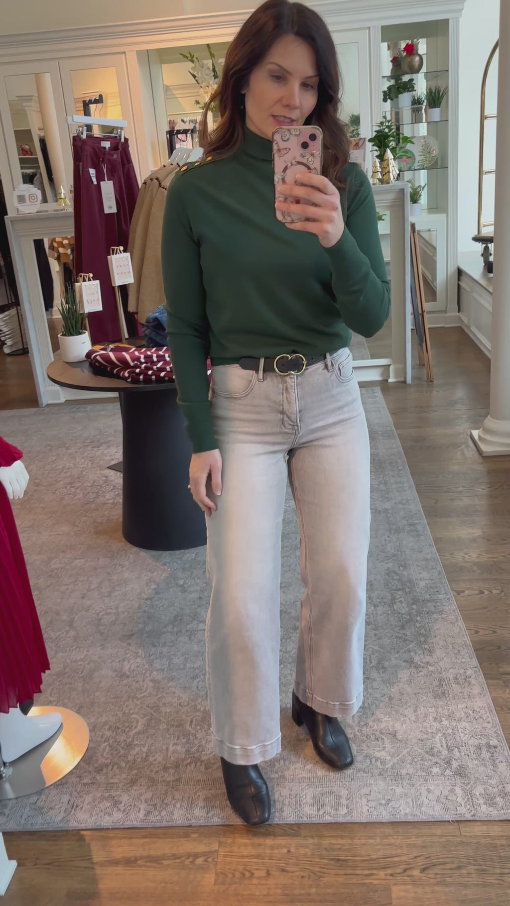 • Hunter Green Gold Button Detail Turtleneck Top